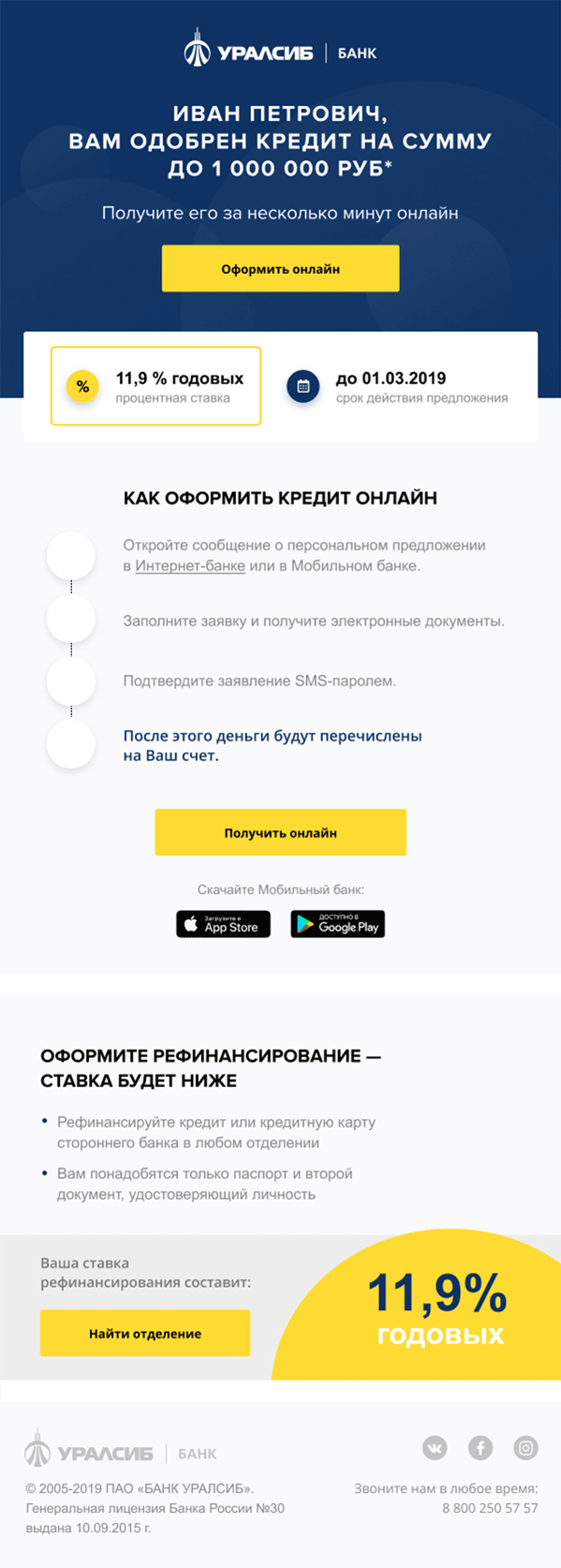 Отправляется только клиентам банка. Имя подписчика и одобренная сумма подставляются автоматически из CRM.